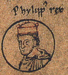 The most important part of the court was the Chancery. Philip's Chancery was in the personal tradition of Henry VI. In other ways, too, Philip's document system does not differ from that of his Hohenstaufen predecessors.[91] In contrast to his predecessors, his rival Otto IV and his nephew Frederick II, Philipp had few seals. The ducal seals for Tuscany and Swabia as well as a wax seal and a gold bull for the royal period are verifiable. This is probably due to the fact that he did not obtain the imperial crown, because it would have led to a change in title.[92][93] With his awarding of charters, Philipp reached considerably further north, north-west (Bremen, Utrecht, Zutphen) and south-west (Savoy, Valence) to assert his kingship.[94] With the issuing of charters, Philipp wanted to bind his followers more closely to himself in these areas as well. His itinerarium is shaped like no other ruling rulers from the Hohenstaufen era by the political situation of the controversy for the throne. An almost orderly move through the empire with continuous notarial activity did not take place.[95] Rather, a regionalization of itinerary, awarding of charters and visits to the court can be identified, which historian Bernd Schütte interpreted as a “withdrawal of the royal central authority”.[96]
