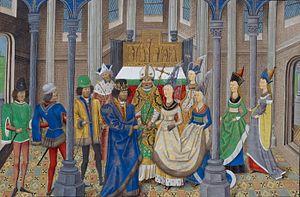 Philippa's influence was documented in literary works. The medieval French poet Eustache Deschamps dedicated one of his ballads to "Phelippe en Lancastre," as a partisan of the Order of the Flower.[17] It has also been speculated that Geoffrey Chaucer may have alluded to Philippa in his poem, "The Legend of Good Women," through the character, Alceste.[18]