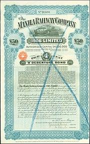 Additional legislation was passed in 1909 authorizing further railway construction and the use of government bonds to finance them, and by 1916, 792.5 kilometers (492.4 mi) of track had been built by the company, which had reorganized itself as the Manila Railroad Company of New Jersey (MRR).[8] Apart from the North and South Main Lines, other lines branching out of these two main lines were built, like the lines to Rosales and San Quintin, Pangasinan; San Jose and Cabanatuan, Nueva Ecija; Dau, Carmen, Floridablanca and Arayat, all in Pampanga province, as well as inside the US Air Base Fort Stotsenburg which became Clark Air Base; Antipolo, Taytay, and Montalban, a spur line to Nielsen Field in what is now Ayala Avenue in the Makati Financial District from Culi Culi (now Pasay Road) Station, all in Rizal province; Cavite City and the nearby US Air Base of Sangley Point as well as Noveleta and Naic, both in Cavite province; Canlubang, Santa Cruz and Pagsanjan all in Laguna province; Batangas City and Bauan both in Batangas province, as well as a line connecting San Pablo City in Laguna to Luta (later Malvar) in Batangas province (this used to be part of Main Line South until a shorter cut-off line connecting Los Banos on the Santa-Cruz/Pangsanjan line to San Pablo was opened); Port Ragay in the Bicol province of Camarines Sur; as well as till Tabaco from Legaspi, Albay.