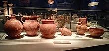 The proposed connection between Mycenaean culture and Philistine culture was further documented by finds at the excavation of Ashdod, Ekron, Ashkelon, and more recently Gath, four of the five Philistine cities in Canaan. The fifth city is Gaza. Especially notable is the early Philistine pottery, a locally made version of the Aegean Mycenaean Late Helladic IIIC pottery, which is decorated in shades of brown and black. This later developed into the distinctive Philistine pottery of the Iron Age I, with black and red decorations on white slip known as Philistine Bichrome ware.[72] Also of particular interest is a large, well-constructed building covering 240 square metres (2,600 sq ft), discovered at Ekron. Its walls are broad, designed to support a second story, and its wide, elaborate entrance leads to a large hall, partly covered with a roof supported on a row of columns. In the floor of the hall is a circular hearth paved with pebbles, as is typical in Mycenaean megaron hall buildings; other unusual architectural features are paved benches and podiums. Among the finds are three small bronze wheels with eight spokes. Such wheels are known to have been used for portable cultic stands in the Aegean region during this period, and it is therefore assumed that this building served cultic functions. Further evidence concerns an inscription in Ekron to PYGN or PYTN, which some have suggested refers to "Potnia", the title given to an ancient Mycenaean goddess. Excavations in Ashkelon, Ekron, and Gath reveal dog and pig bones which show signs of having been butchered, implying that these animals were part of the residents' diet.[73][74] Among other findings there are wineries where fermented wine was produced, as well as loom weights resembling those of Mycenaean sites in Greece.[75]