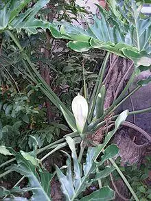 When philodendrons are ready to reproduce, they will produce an inflorescence which consists of a leaf-like hood called a spathe within which is enclosed a tube-like structure called a spadix.[14] Depending on the species, a single inflorescence can be produced or a cluster of up to 11 inflorescences can be produced at a single time on short peduncles. The spathe tends to be waxy and is usually bicolored. In some philodendrons, the colour of the base of the spathe contrasts in colour with the upper part, and in others, the inner and outer surfaces of the spathe differ in coloration. The paler colour tends to be either white or green, and the darker usually red or crimson. Pelargonidin is the predominant pigment causing the red coloration in the spathes. The upper portion of the spathe is called the limb or blade, while the lower portion is called the convolute tube or chamber due to its tubular structure at the base. The spadix is more often than not white and shorter than the spathe. On the spadix are found fertile female, fertile male, and sterile male flowers. The fertile male and female flowers are separated on the spadix by a sterile zone or staminodal region composed of sterile male flowers. This barrier of sterile male flowers ensures fertile male flowers do not fertilize the female flowers. The arrangement tends to be vertical, with fertile male flowers at the top of the spadix followed by sterile male flowers, and fertile female flowers very close to the bottom in the region known as the spathe tube or chamber.[15] In some philodendrons, an additional region of sterile male flowers is found at the very top of the spadix. The fertile female flowers are often not receptive to fertilization when the fertile males are producing pollen, which again prevents self-pollination. The pollen itself is thread-like and appears to project out from the region where the fertile male flowers are located.