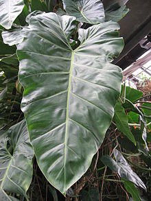 The leaves are usually large and imposing, often lobed or deeply cut, and may be more or less pinnate. They can also be oval, spear-shaped, or in many other possible shape variations. The leaves are borne alternately on the stem. A quality of philodendrons is that they do not have a single type of leaf on the same plant. Instead, they have juvenile leaves and adult leaves, which can be drastically different from one another. The leaves of seedling philodendrons are usually heart-shaped. Early in the life of the plant, but after it has matured past the seedling stage, the leaves will have acquired the typical juvenile leaf's shape and size. Later in the philodendron's life, it starts producing adult leaves, a process called metamorphosis.[8] Most philodendrons go through metamorphosis gradually; there is no immediately distinct difference between juvenile and adult leaves.[9] Aside from being typically much bigger than the juvenile leaves, the shape of adult leaves can be significantly different. In fact, considerable taxonomic difficulty has occurred in the past due to these differences, causing juvenile and adult plants to mistakenly be classified as different species. The trigger for the transformation to adult leaves can vary considerably. One possible trigger is the height of the plant. Secondary hemiepiphytes start off on the dark forest floor and climb their way up a tree, displaying their juvenile type leaves along the way. Once they reach a sufficient height, they begin developing adult type leaves. The smaller juvenile leaves are used for the darker forest floor where light is in scarce supply, but once they reach a sufficient height in the canopy the light is bright enough that the bigger adult leaves can serve a useful purpose. Another possible trigger occurs in primary hemiepiphytes. These philodendrons typically send their aerial roots downward. Once their roots have reached the ground below, the plant will begin taking up nutrients from the soil, of which it had been previously deprived.[10] As a result, the plant will quickly morph into its adult leaves and gain in size dramatically. Another quality of philodendrons leaves is they are often quite different in shape and size even between two plants of the same species. As a result of all these different possible leaf shapes, it is often difficult to differentiate natural variations from morphogenesis.