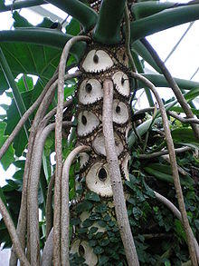 Philodendrons also produce cataphylls, which are modified leaves that surround and protect the newly forming leaves. Cataphylls are usually green, leaf-like, and rigid while they are protecting the leaf. In some species, they can even be rather succulent. Once the leaf has been fully formed, the cataphyll usually remains attached where the stem and base of the leaf meet. In philodendrons, cataphylls typically fall into two categories: deciduous and persistent types.[11] A deciduous cataphyll curls away from the leaf once it has formed, eventually turning brown and drying out, and finally falling off the plant, leaving a scar on the stem where it was attached. Deciduous cataphylls are typically found on vining philodendrons, whereas persistent cataphylls are typical of epiphytic philodendrons or appressed climbers. In the latter, the cataphylls are prevented from falling off in a timely manner due to the short internodes of the plant. The cataphylls will remain attached, drying out and becoming nothing more than fibers attached at the nodes. In some philodendrons, the cataphylls build up over time and eventually form a wet mass at the nodes. This may keep emerging roots moist and provide some form of lubrication to new leaves.