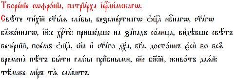 Transliteration into modern Russian letters: Свете Тихий святыя славы, безсмертнаго Отца небеснаго, святаго блаженнаго, Иисусе Христе: пришедше на запад солнца, видевше свет вечерний, поем Отца, Сына, и Святаго Духа, Бога. Достоин еси во вся времена пет быти гласы преподобными, Сыне Божий, живот даяй: темже мир тя славит.