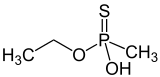 A thiophosphonate group is a functional group related to phosphonate by substitution of an oxygen atom for a sulphur. They are a reactive component of many pesticides and nerve agents. Substituted thiophosphonates can have 2 main structural isomers bonding though either O or S groups to give thione and thiol forms respectively. This is a property they share with related functional groups such as thiocarboxylic acids and organothiophosphates.
