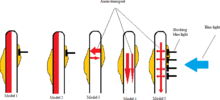 Model five encompasses elements of both model 3 and 4. The main auxin flow in this model comes from the top of the plant vertically down towards the base of the plant with some of the auxin travelling horizontally from the main auxin flow to both sides of the plant. Receiving light inhibits the horizontal auxin flow from the main vertical auxin flow to the irradiated exposed side. And according to the study by Sakai and Haga, the observed asymmetric auxin distribution and subsequent phototropic response in hypocotyls seems most consistent with this fifth scenario.[12]