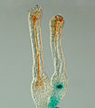 The polycomb gene FIE is expressed (blue) in unfertilised egg cells of the moss P. patens (right) and expression ceases after fertilisation in the developing diploid sporophyte (left). In situ GUS staining of two female sex organs (archegonia) of a transgenic plant expressing a translational fusion of FIE-uidA under control of the native FIE promoter.[22]