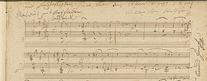 Beethoven's previous piano sonata, popularly known as Les Adieux, was composed almost five years before Op. 90. Beethoven's autograph survives and is dated August 16. The sonata was published almost a year later, in June 1815, by S. A. Steiner, after Beethoven made a few corrections.[1] Beethoven's letter to Prince Moritz von Lichnowsky, sent in September 1814, explains the dedication: