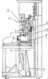 1. Pedal. 2. Pedal connection. 3. Exhauster (one only shown). 4. Reservoir; high tension (low-tension reservoir not shown.) 5. Exhaust trunk. 6. Exhaust tube to motor. 7. Air space above primary valves. 8. Secondary valves. 9. Striking pneumatic. 10. Connection from pneumatic to action of piano. 11. Piano action. 12. Pneumatic motor. 13. Trackerboard (music roll passes over trackerboard).