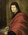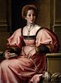 In his portraits he adhered to Mannerist style, utilizing a slight Contrapposto in the sitter with their head turned from the body. This pose gave the depiction a spontaneity and sense of movement for the innovative Mannerists, but was eventually so formulaic that it lost its intention of originality. Foschi’ Portrait of a Lady and Portrait of a Man Weaving a Wreath of Flowers, shows an interesting use of back ground and subtle symbolisms to convey the essence of the sitter, while his Portrait of a Man (at the Uffizi), shows a more standard portrait depiction of the period.