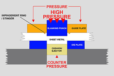 Fine blanking presses are similar to other metal stamping presses, but they have a few critical additional parts. A typical compound fine blanking press includes a hardened die punch (male), the hardened blanking die (female), and a guide plate of similar shape/size to the blanking die. The guide plate is the first applied to the material, impinging the material with a sharp protrusion or stinger around the perimeter of the die opening. Next, a counter pressure is applied opposite the punch, and finally, the die punch forces the material through the die opening. Since the guide plate holds the material so tightly, and since the counter pressure is applied, the material is cut in a manner more like extrusion than typical punching. Mechanical properties of the cut benefit similarly with a hardened layer at the cut edge of the part.[6] Because the material is so tightly held and controlled in this setup, part flatness remains very true, distortion is nearly eliminated, and edge burr is minimal. Clearances between the die and punch are generally around 1% of the cut material thickness, which typically varies between 0.5–13 mm (0.020–0.512 in).[7] Currently parts as thick as 19 mm (0.75 in) can be cut using fine blanking.[8] Tolerances between ±0.0003–0.002 in (0.0076–0.0508 mm) are possible, depending on the base material thickness and tensile strength, and part layout.[9]