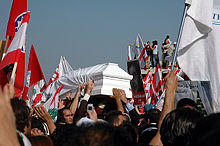 A funeral ceremony for him was held on Martyrs' Square on 23 November 2006 with the participation of hundreds of thousands of supporters of the 14 March Alliance, and turned to be a political character.[11] His body was buried in his hometown Bikfaya after Patriarch Nasrallah Sfeir performed the rites in Beirut.[1][23]