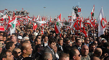 Others have, however, put forward many conspiracy theories regarding the murder[21] such as a possible false flag operation. Many have questioned Syria's interest in targeting the Christian society as that could have the effect of destabilising a rival Christian party, namely Michel Aoun's Free Patriotic Movement which, together with Hassan Nasrallah's Shia Group Hezbollah, forms the largest parliamentary pro-Syrian block. However the pro-Syrian coalition managed to establish a sit-in, later growing into a protest camp, in the martyr's square downtown Beirut, to insist on their demands.
