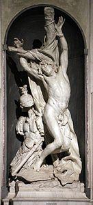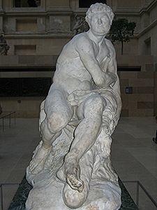 Puget's Milon of Croton (1682) is a monumental work, nearly three meters high, is one of his most dramatic and expressive works. Illustrating a story by Ovid, it depicts the moment when Milon de Croton, a celebrated warrior but now elderly and weak, is attacked by a lion. His expression at the moment the lion claws Milon's is distorted by pain, and is full of pathos.[16] This work was satisfactory to Colbert, was purchased by the royal government, and given a prominent place in the Gardens of Versailles.[22] Puget in the meantime had begun on another monumental statue for Versailles, of Andromeda.[21]