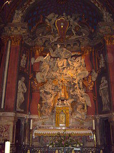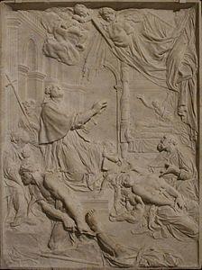 Puget decided to stay for a time in Italy, making long visits to Rome and Genoa. His principal patron in Italy was an Italian nobleman, Francesco Maria Sauli] His major works during this period were two monumental statues for the pillars of the church of Santa Maria di Carignano, representing Saint Sebastian and Bishop Alexander Paoli. They were completed in 1663, and showed the influence of Bernini. [14] He also made a notable statue, The Immaculate Conception, for the French patron Emmanuel Brignole, for the chapel of an Albergo in Genoa. The Genoese senate proposed that he paint their council chamber, but he declined, to devote all his attention to sculpture.[13]