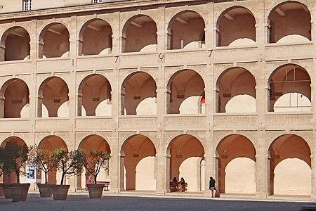 In 1672, having no further work at the Naval Arsenal, Puget returned to his birthplace, Marseille. His first project was a new urban square and street, the Cours Saint-Louis, and rue Canabière. It took much of its inspiration from the urban planning and architecture of Genoa, and resembled on a small scale the later urban projects of Baron Haussmann and Napoleon III in Paris.[20] He also created an ornate sculptural plaque with the coast of arms of the King to decorate the facade of the Hotel de Ville. He designed a new fish market, completed in 1672, which is still in use, and La Vieille Charité, begun in 1679, originally a home for beggars and the indigent, now a cultural center. In addition, he designed town houses in Aix-en-Provence, including the Hotel d'Aiguilles (1675), a baroque mansion.[14]
