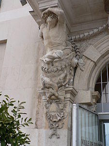 In 1650, he was living in Toulon, and was married there. He turned his attention entirely to sculpture. In 1655 he received his first important commission for the sculptural decoration of the entrance of the town hall of Toulon; he produced a porch supported by muscular caryatids, still in existence on a new municipal building facing the port. He used as his models two of the muscular workers who unloaded ships along the quay in front of the building. Their faces and postures in the sculpture vividly expressed their struggle with the weight on their shoulders.[9] The work was finished in 1657. He was paid fifteen hundred livres, to which the city authorities, pleased with the work, added a supplement of two hundred livres. His work was widely praised, and terra-cotta copies were made and circulated. Puget was converted from a modestly-talented painter to a celebrated sculptor.[8][10]
