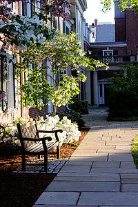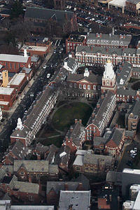 Yale built the Pierson College buildings in the Georgian or "Georgian Revival" architectural style. These include a prominent tower, inspired by that of Philadelphia's Independence Hall.[1] It is one of the eight original residential colleges bequeathed by Edward Harkness and designed by James Gamble Rogers.