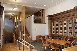 The renovation of 2003-04 was extensive, and included the reconfiguration of student suites, student activities areas, and dining facilities; new bathrooms, new interior finishes and lighting; additional student rooms in a new Upper Court building; complete replacement of all mechanical and electrical systems; new security, fire protection, and information technology systems; new elevators, ramps, and other enhancements to accessibility; and repairs to windows, masonry, roofs, and gutters.[17] The renovation also included enlarging the library and adding a mezzanine level computer cluster.[17] The completion of the additional building, called "Upper Court", increased Pierson College's dorm space capacity from 264 to 310.[17] During the renovation, students who would otherwise live in Pierson College, lived in what is called "Swing Space," dormitories located near Payne Whitney Gymnasium that resemble a cheap hotel and do not include a dining hall.[17]