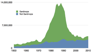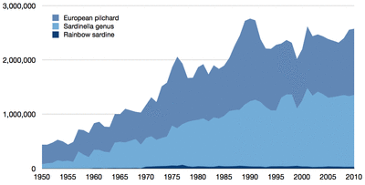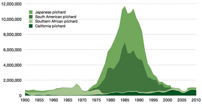 In the 1980s the South American pilchard, Sardinops sagax, was the most intensively fished species of sardine. Some major stocks declined precipitously in the 1990s (see chart below).