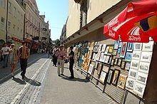 Out of several locations across Vilnius used by market traders to sell the wares of folk artists, Pilies Street is the most popular. It has a natural advantage over the Town Hall Square as the street is generally busy and less likely to be interrupted by the political or cultural events commonly held at the Town Hall. Many people visit the street to buy gifts at Christmas or before going abroad to visit friends. The market is also popular with souvenir hunters. Souvenir shops offer amberware and amber jewelry as well as linen clothes. The street is also known for the Kaziukas Fair, when folk artists from all four corners of Lithuania gather here to display and sell their latest merchandise.