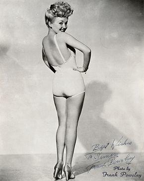 Beginning in the early 19th century, pin-up modeling had "theatrical origins"; burlesque performers and actresses sometimes used photographic advertisement as business cards to advertise shows. These promotion and business cards could often be found backstage in almost every theater's green room, pinned-up or stuck into "frames of the looking-glasses, in the joints of the gas-burners, and sometimes lying on-top of the sacred cast-case itself."[3] "To understand both the complicated identity and the subversive nature of the 19th-century actress, one must also understand that the era's views on women's potential were inextricably tied to their sexuality, which in turn was tied to their level of visibility in the public sphere: regardless of race, class or background, it was generally assumed that the more public the woman, the more 'public,' or available, her sexuality”, according to historian Maria Elena Buszek. Being sexually fantasized, famous actresses in early-20th-century film were both drawn and photographed and put on posters to be sold for personal entertainment.[4] Among the celebrities who were considered sex symbols, one of the most popular early pin-up girls was Betty Grable, whose poster was ubiquitous in the lockers of G.I.s during World War II.