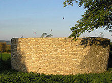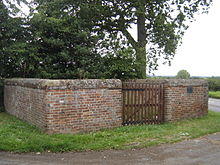 A high-walled and lockable structure served several purposes; the most common use was to hold stray sheep, pigs and cattle until they were claimed by the owners, usually for the payment of a fine or levy.[3] The pound could be as small as 20 square metres (225 sq ft) or as big as 0.20 hectares (1&fras1;2 acre) and may be circular or square. Early pounds had just briar hedges, but most were built in stone or brick, making them more stock-proof. The size and shape of village pounds varies. Some are four-sided—rectangular, square and irregular—while others are circular. In size they vary from a few square metres (some square feet) to over 0.5 hectares (1.2 acres). Pounds are known to date from the medieval period. By the 16th century most villages and townships would have had a pound. Most of what remain today would date from the 16th and 17th centuries. Some are listed buildings, but most have fallen into disrepair.[4]
