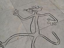 The Pink Panther is a fictional animated character who appeared in the opening and/or closing credit sequences of every film in The Pink Panther series except for A Shot in the Dark and Inspector Clouseau.[1] In the storyline of the original film, the "Pink Panther" was the name of a valuable pink diamond named for a flaw that showed a "figure of a springing panther" when held up to the light in a certain way; in the credits this was translated to an animated pink panther.