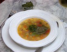 Pistou is a typical condiment from the Provence region of France most often associated with the Provençal dish soupe au pistou, which resembles minestrone and may include white beans, green beans, tomatoes, summer squash, potatoes, and pasta. The pistou is incorporated into the soup just before serving.[4]