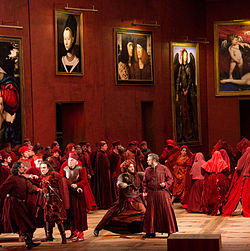 Domingo has sung 151 roles in Italian, French, German, English, Spanish and Russian.[5][6] His main repertoire however is Italian (Otello; Cavaradossi in Tosca; Don Carlo; Des Grieux in Manon Lescaut; Dick Johnson in La fanciulla del West; Radames in Aida); French (Don José in Carmen; Samson in Samson and Delilah; Hoffmann in Les Contes d'Hoffmann); and German (Lohengrin, Parsifal, and Siegmund in Die Walküre). He has appeared in more operas by Giuseppe Verdi than any other composer. Domingo has created original roles in eight world premieres of operas, Vásquez's El último sueño, Moreno Torroba's El poeta, Menotti's Goya, García Abril's Divinas palabras, Cano's Luna, Drattell's Nicholas and Alexandra, Tan Dun's The First Emperor, and Catán's Il Postino, as well as one pasticcio, The Enchanted Island. He also performed in the U.S. premieres of Don Rodrigo and Cyrano de Bergerac. He continues to add more roles to his repertoire, most recently performing as Schicchi in Puccini's one-act opera Gianni Schicchi in September 2015.