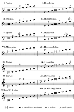 The authentic modes were the odd-numbered modes 1, 3, 5, 7, and this distinction was extended to the Aeolian and Ionian modes when they were added to the original eight Gregorian modes in 1547 by Glareanus in his Dodecachordon (Powers 2001a). The final of an authentic mode is the tonic, though the range of modes 1, 2, and 7 may occasionally descend one step further. This added degree is called the "subfinal" which, since it lies a whole tone below the final, is also the "subtonium" of the mode. The range of mode 5 (Lydian) does not employ a subfinal, and so always maintains F as its lower limit (Powers 2001d). These four modes correspond to the modern modal scales starting on re (Dorian), mi (Phrygian), fa (Lydian), and so (Mixolydian) (Vinden 2008, 3). The tenor, or dominant (corresponding to the "reciting tone" of the psalm tones), is a fifth above the final of the scale, with the exception of mode 3 (Phrygian), where it is a sixth above the final. This is because a fifth above the tonic of mode 3 is the "unstable" ti (in modern solfège), which may be flattened to ta.
