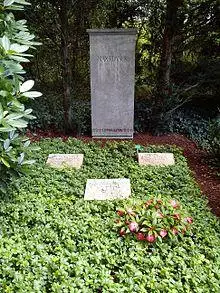In 1945, Planck's son Erwin was arrested following the attempted assassination of Hitler in the 20 July plot. Erwin consequently died at the hands of the Gestapo; his death destroyed much of Max Planck's will to live.[30] After the end of the war Planck, his second wife, and his son by her were brought to a relative in Göttingen, where Planck died on 4 October 1947. His grave is situated in the old Stadtfriedhof (City Cemetery) in Göttingen.[31]