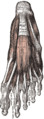 Muscles of the sole of the foot. First layer (closest to the skin on the sole of the foot). Plantar aponeurosis visible at top center. | |