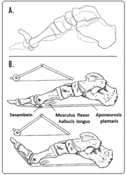 The plantar fascia also has an important role in dynamic function during gait. It was found the plantar fascia continuously elongated during the contact phase of gait. It went through rapid elongation before and immediately after mid-stance, reaching a maximum of 9% to 12% elongation between mid-stance and toe-off.[3] During this phase the plantar fascia behaves like a spring, which may assist in conserving energy. In addition, the plantar fascia has a critical role in normal mechanical function of the foot, contributing to the "windlass mechanism". When the toes are dorsiflexed in the propulsive phase of gait, the plantar fascia becomes tense, resulting in elevation of the longitudinal arch and shortening of the foot (see 3A). One can liken this mechanism to a cable being wound around the drum of a windlass (see 3B); the plantar fascia being the cable, the metatarsal head the drum, and the handle, the proximal phalanx.