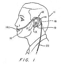 miniaturized headset wherein a hearing-aid size microphone transducer and a similarly miniaturized transducer are placed in a capsule mounted near the user's ear; speech is conducted to the microphone via an acoustic tube positioned near the user's mouth, while incoming communications emanating from the receiver are conducted to the user's ear via a second acoustic tube.[6]