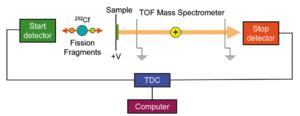 Plasma desorption ionization mass spectrometry (PDMS), also called fission fragment ionization, is a mass spectrometry technique in which ionization of material in a solid sample is accomplished by bombarding it with ionic or neutral atoms formed as a result of the nuclear fission of a suitable nuclide, typically the californium isotope 252Cf.[37][38]
