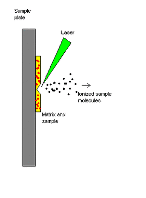 Matrix-assisted laser desorption/ionization (MALDI) is a soft ionization technique. The sample is mixed with a matrix material. Upon receiving a laser pulse, the matrix absorbs the laser energy and it is thought that primarily the matrix is desorbed and ionized (by addition of a proton) by this event. The analyte molecules are also desorbed. The matrix is then thought to transfer proton to the analyte molecules (e.g., protein molecules), thus charging the analyte.