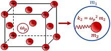 The negative effective mass (density) becomes also possible based on the electro-mechanical coupling exploiting plasma oscillations of a free electron gas (see Figure 2).[8][9] The negative mass appears as a result of vibration of a metallic particle with a frequency of which is close the frequency of the plasma oscillations of the electron gas relatively to the ionic lattice . The plasma oscillations are represented with the elastic spring , where is the plasma frequency. Thus, the metallic particle vibrated with the external frequency ω is described by the effective mass