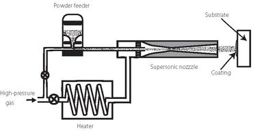 In cold spraying, particles are accelerated to very high speeds by the carrier gas forced through a converging–diverging de Laval type nozzle. Upon impact, solid particles with sufficient kinetic energy deform plastically and bond mechanically to the substrate to form a coating. The critical velocity needed to form bonding depends on the material's properties, powder size and temperature. Metals, polymers, ceramics, composite materials and nanocrystalline powders can be deposited using cold spraying.[7] Soft metals such as Cu and Al are best suited for cold spraying, but coating of other materials (W, Ta, Ti, MCrAlY, WC–Co, etc.) by cold spraying has been reported.[1]