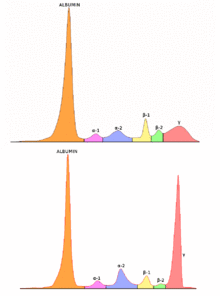 - ^ O'Connell TX, Horita TJ, Kasravi B (January 2005). "Understanding and interpreting serum protein electrophoresis". Am Fam Physician. 71 (1): 105–12. PMID 15663032.