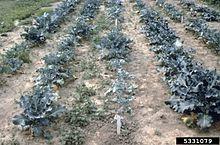 Cabbage clubroot is a disease of Brassicaceae (mustard family or cabbage family) caused by the soil-borne Plasmodiophora brassicae.[8] The disease first appears scattered in fields, but in successive seasons it will infect the entire field, reducing the yield significantly and sometimes resulting in no yield at all. Symptoms appear as yellowing, wilting, stunting, and galls on the roots. It is transmitted by contaminated transplants, animals, surface water runoff, contaminated equipment, and irrigation water.[8] The pathogen can survive in a field for years as resting spores without a host present and will infect the next crop planted if it is a susceptible host. This pathogen prefers a wet climate and a pH around 5.7, so proper irrigation and the addition of compounds that raise the pH can be used to control this disease.[9] Other control methods include sanitation to prevent transmission, chemical control, and resistant varieties.