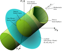 The Huber–von Mises criterion[10] is based on the Tresca criterion but takes into account the assumption that hydrostatic stresses do not contribute to material failure. M. T. Huber was the first who proposed the criterion of shear energy.[11][12] Von Mises solves for an effective stress under uniaxial loading, subtracting out hydrostatic stresses, and states that all effective stresses greater than that which causes material failure in uniaxial loading will result in plastic deformation.