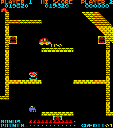 This genre lacks a commonly agreed upon name in the West, but games in the genre are most commonly called "comical action games" (CAGs) in Japan.[97][98] The original arcade Mario Bros. is generally recognized as the originator of this genre, though Bubble Bobble is also highly influential. These games are characterized by single screen, non-scrolling levels and often contain cooperative two-player action. A level is cleared when all enemies on the screen have been defeated, and vanquished foes usually drop score bonuses in the form of fruit or other items. CAGs are almost exclusively developed in Japan and are either arcade games, or sequels to arcade games, though they are also a common genre among amateur doujinshi games. Other examples include Don Doko Don, Snow Bros. and Nightmare in the Dark.