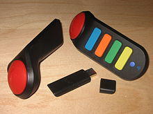 The Buzz! buzzer is a special controller designed specifically for the Buzz! quiz game series. The controller features a large red buzzer button and four smaller coloured buttons for answer selection. Both wired and wireless versions are available and come bundled with Buzz! games. A four-buzzer set acts as a single USB device and connects a USB port on the PlayStation 3 (or PlayStation 2). Wireless versions connect via a USB dongle, with each dongle able to support up to 4 wireless buzzers at a time. A second dongle is required for additional buzzers (for 8 player games). Both the wired and wireless versions of the buzzers are compatible with both PlayStation 2 and PlayStation 3.