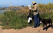 Artist working en plein air, using a Pochade box at Pigeon Point Lighthouse in California.
