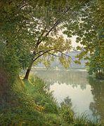Before the 19th century, artists had mixed their own paints from raw pigments that they often ground themselves from a variety of media. This had made for inconvenient portability and kept most painting activities confined to the studio. This changed in the 1800s, when tubes of oil paint became available allowing En plein air painting to become viable for many artists. In the 1830s, the Barbizon school in France that included Charles-François Daubigny and Théodore Rousseau used the practise to accurately depict the changing appearance of light as weather conditions altered.[4] In the early 1860s, four young painters: Claude Monet, Pierre-Auguste Renoir, Alfred Sisley and Frédéric Bazille, met whilst studying under the academic artist Charles Gleyre. They discovered that they shared an interest in painting landscape and contemporary life and they often ventured into the countryside together to paint in the open air.[5] They discovered that they could paint in sunlight directly from nature and making use of the vivid synthetic pigments that were available they began to develop a lighter and brighter manner of painting that extended further the Realism of Gustave Courbet and the Barbizon school[6] It was radical practise at its inception but by the later decades of the 19th-century the theory had been absorbed into normal artistic practise . There were artists' colonies across France such as the one at Étaples on the Côte d'Opal that included landscape impressionists Eugène Chigot and Henri Le Sidaner. The later artist specialised in translating nocturne light to canvas using oil and pastel.[7]