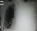 A pleural effusion appears as an area of whiteness on a standard posteroanterior chest X-ray.[7] Normally, the space between the visceral pleura and the parietal pleura cannot be seen. A pleural effusion infiltrates the space between these layers. Because the pleural effusion has a density similar to water, it can be seen on radiographs. Since the effusion has greater density than the rest of the lung, it gravitates towards the lower portions of the pleural cavity. The pleural effusion behaves according to basic fluid dynamics, conforming to the shape of pleural space, which is determined by the lung and chest wall. If the pleural space contains both air and fluid, then an air-fluid level that is horizontal will be present, instead of conforming to the lung space.[8] Chest radiographs in the lateral decubitus position (with the patient lying on the side of the pleural effusion) are more sensitive and can detect as little as 50 mL of fluid. At least 300 mL of fluid must be present before upright chest X-rays can detect a pleural effusion (e.g., blunted costophrenic angles).