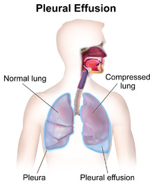 The most common causes of transudative pleural effusion in the United States are heart failure and cirrhosis. Nephrotic syndrome, leading to the loss of large amounts of albumin in urine and resultant low albumin levels in the blood and reduced colloid osmotic pressure, is another less common cause of pleural effusion. Pulmonary emboli were once thought to cause transudative effusions, but have been recently shown to be exudative.[1] The mechanism for the exudative pleural effusion in pulmonary thromboembolism is probably related to increased permeability of the capillaries in the lung, which results from the release of cytokines or inflammatory mediators (e.g. vascular endothelial growth factor) from the platelet-rich blood clots. The excessive interstitial lung fluid traverses the visceral pleura and accumulates in the pleural space.