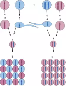 9) The diploid zygote proceeds by mitotic division to build a new entirely diploid organism. These cells possess both the purple and blue genes, but only the purple gene is expressed since it is dominant over the recessive blue gene.