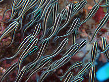 Juveniles of Plotosus species often form dense aggregations; in P. lineatus juveniles form dense ball-shaped schools of about 100 fish, while adults are solitary or occur in smaller groups of around 20 and are known to hide under ledges during the day.[3][4][5]